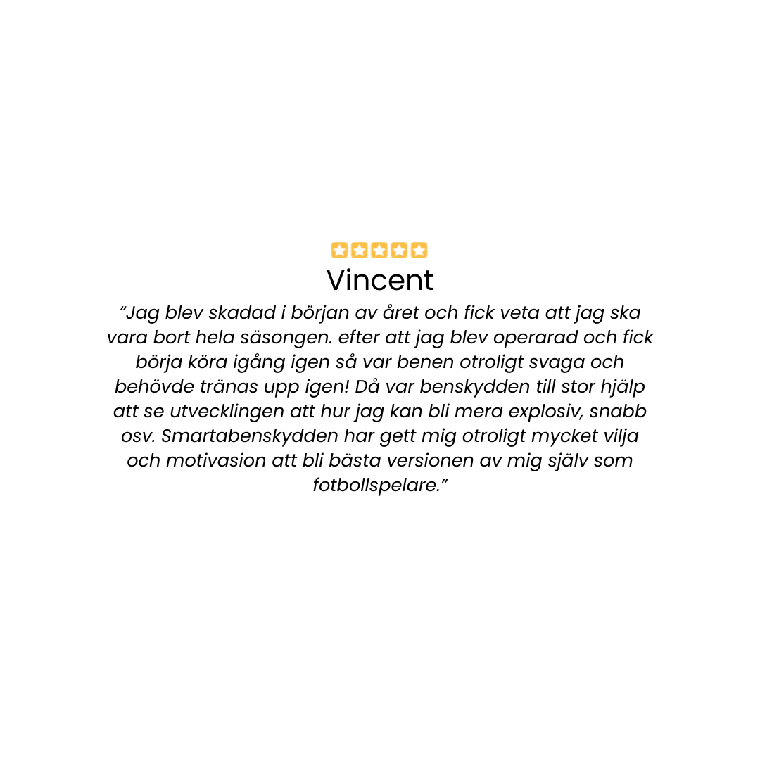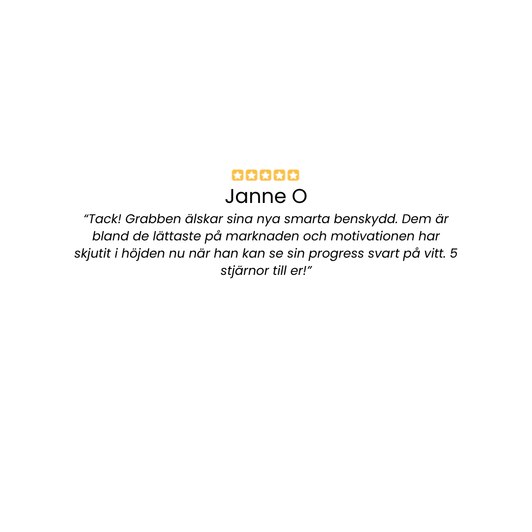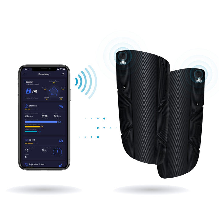 SSG Pro från Smarta Benskydd spårar och mäter dina prestationsinsikter i total sträcka, total distans per min, totalt antal steg, höghastighets löpsträcka, sprintsträcka, kalorier, totala sprints, totala höghastighetskörningar, maxhastighet, maxacceleration, skarpa svängar, Totala hopp, Max hopphöjd, Max sparkkraft, Användning av vänster fot (%), Användare av höger fot (%).