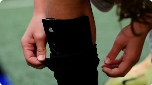 Slå på spårningsensorerna genom att trycka på knappen i 5 sek och placera dem i benskydden. SSG Pro mäter, bearbetar och registrerar statistik automatiskt.